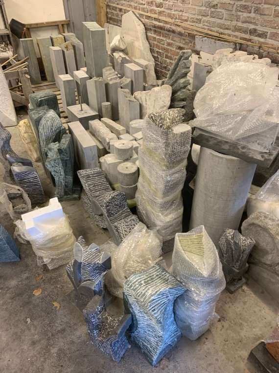 In dit beeldhouwen is hij ambachtelijk bezig met kappen en hakken, zagen, slijpen en boren in zijn favoriete materiaal : arduin, de blauwe steen, hoewel ook graniet, marmer en de wat zachtere Franse steen onder handen genomen worden. Dat de beeldhouwer zijn voordeel doet met de ervaring en de creativiteit, de artistieke verworvenheden dus van de schilder , ligt voor de hand, zodat hij ook in deze discipline aansluit bij het scheppen van “ruimtelijk” werk via tegengestelde bewegingen: verticaal versus horizontaal, ronde openingen of dito uitstulpingen.